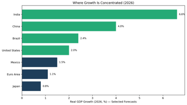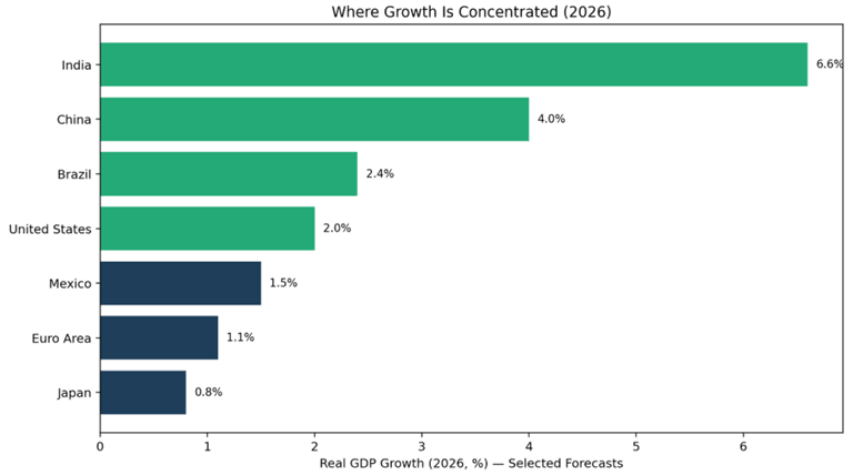 Global growth is still strongest in parts of emerging markets (notably India), while several developed regions (Europe/Japan) look slower but potentially offer valuation advantages.