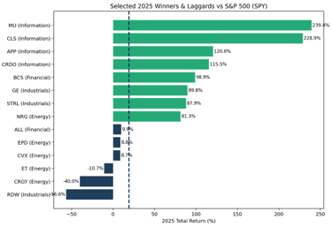 At the beginning of 2025, I identified 4 industries to focus my sock recommendations – Financial Services, Information Technology, Industrials, and Energy. Of my selections, 3 of the 4 industries outperformed the S&P 500. My Financial Services picks averaged 43.0%, Information Technology averaged 90.7%, Industrials averaged 36.5%, and Energy averaged 13.6%, versus SPY at 19.17%.